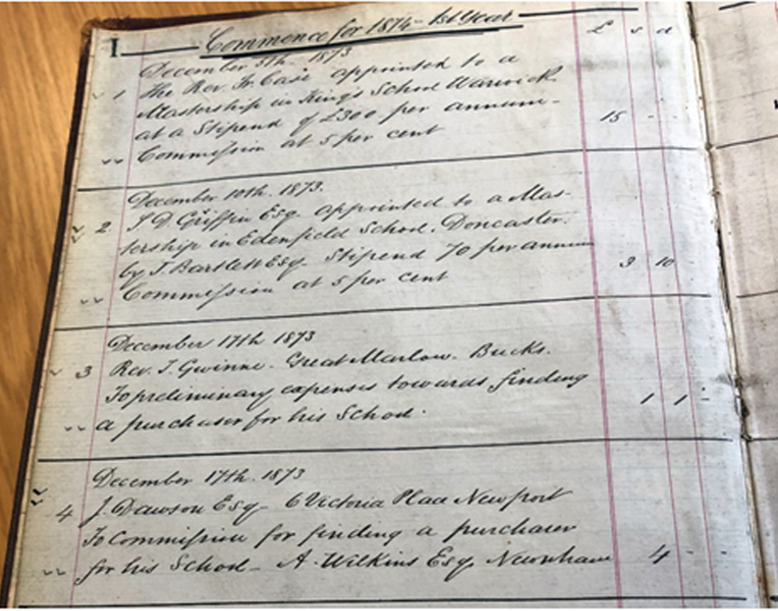 這是當(dāng)年的手賬本,記錄著英國(guó)加比達(dá)斯教育集團(tuán)的第一個(gè)客戶, 來自學(xué)校Kings School, Warwick。1873年12月5日加比達(dá)斯為其招募校長(zhǎng)。